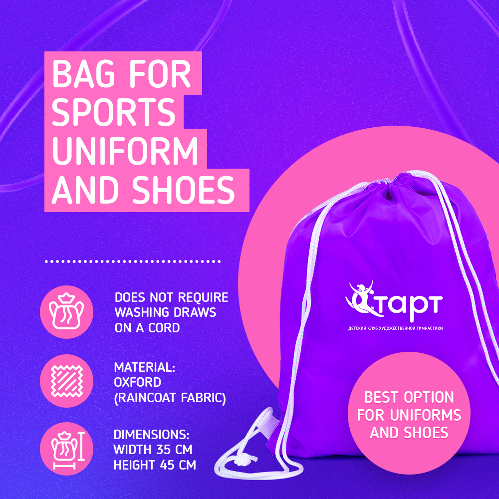 Stylish sports bag for uniforms and shoes. Very easy to use, as it does not require washing, just wipe the surface with a damp cloth. And it contains everything you need for training.